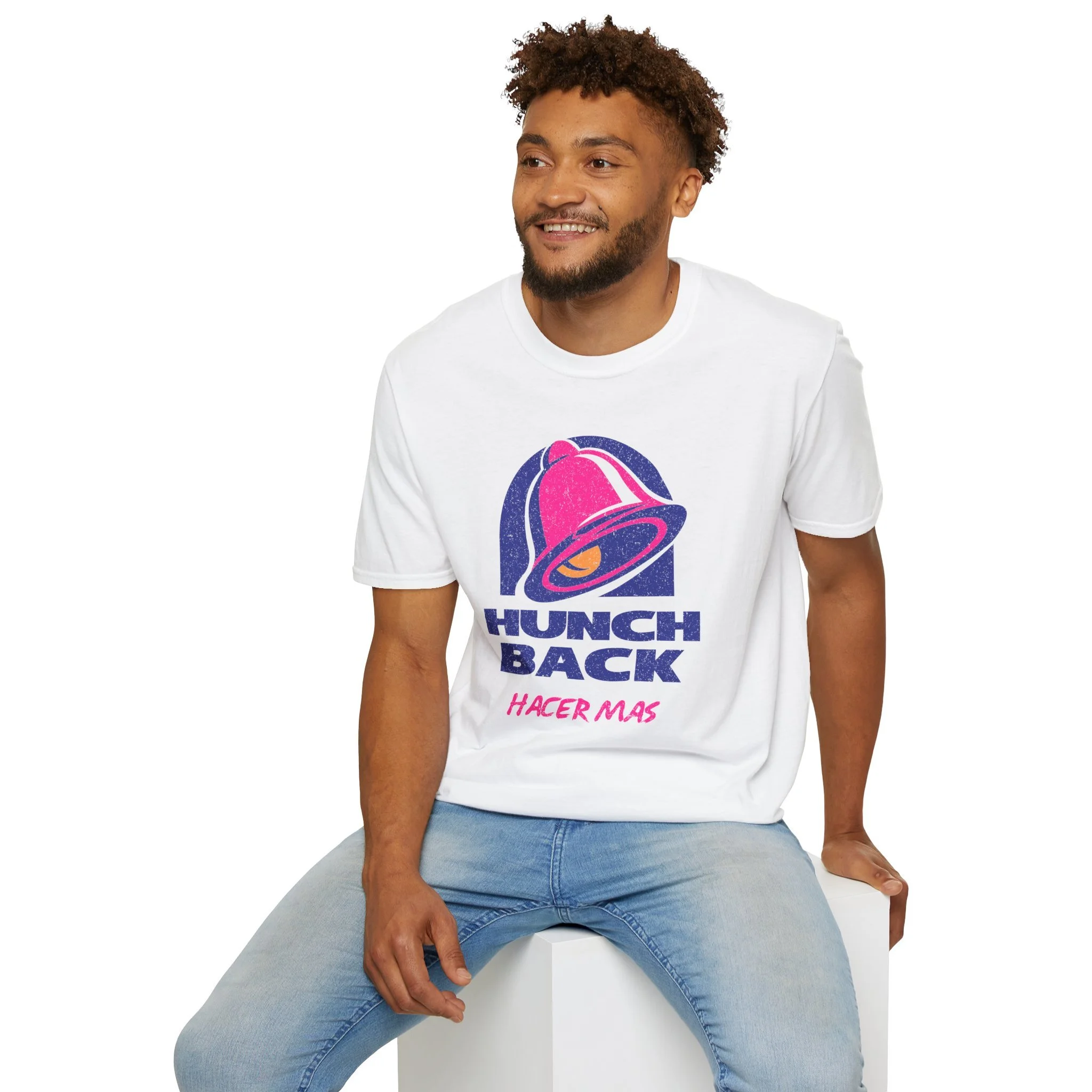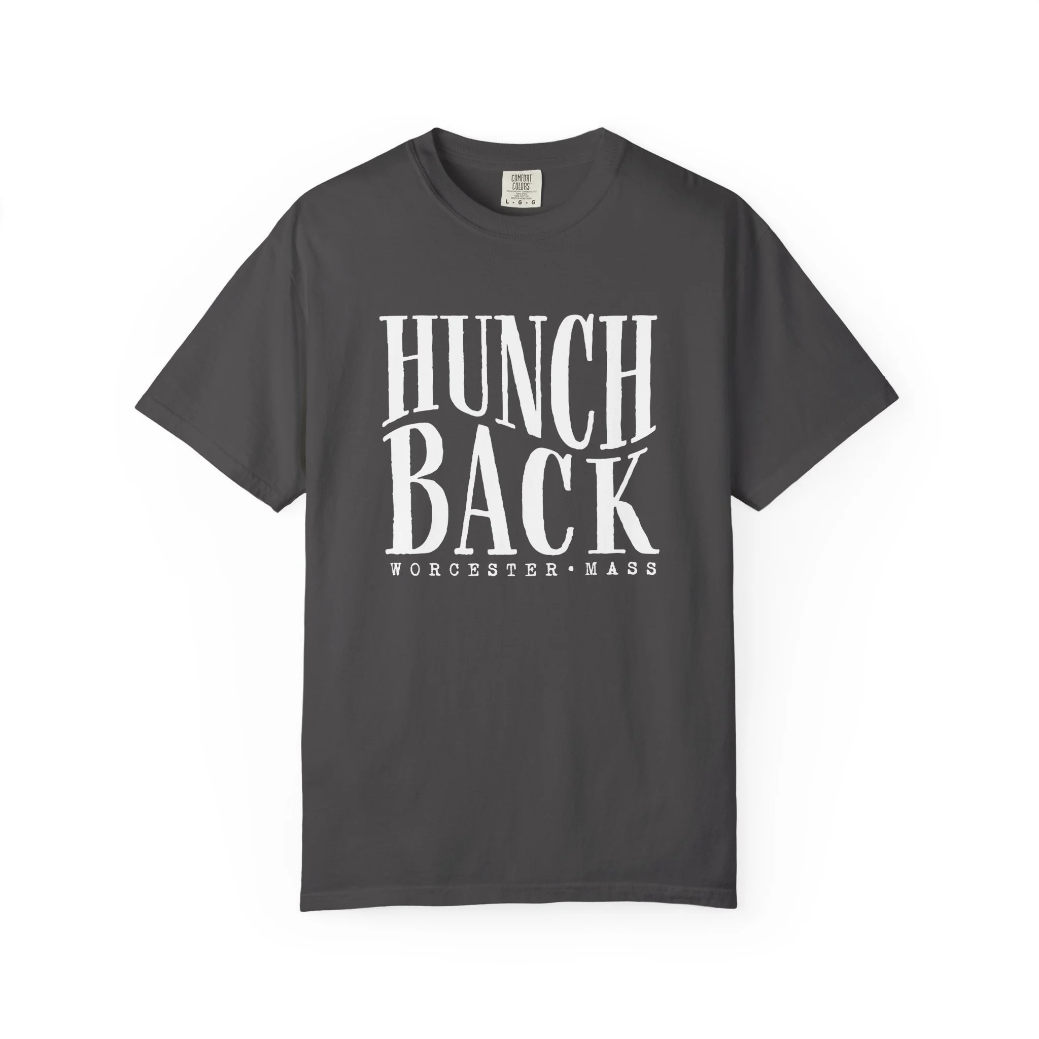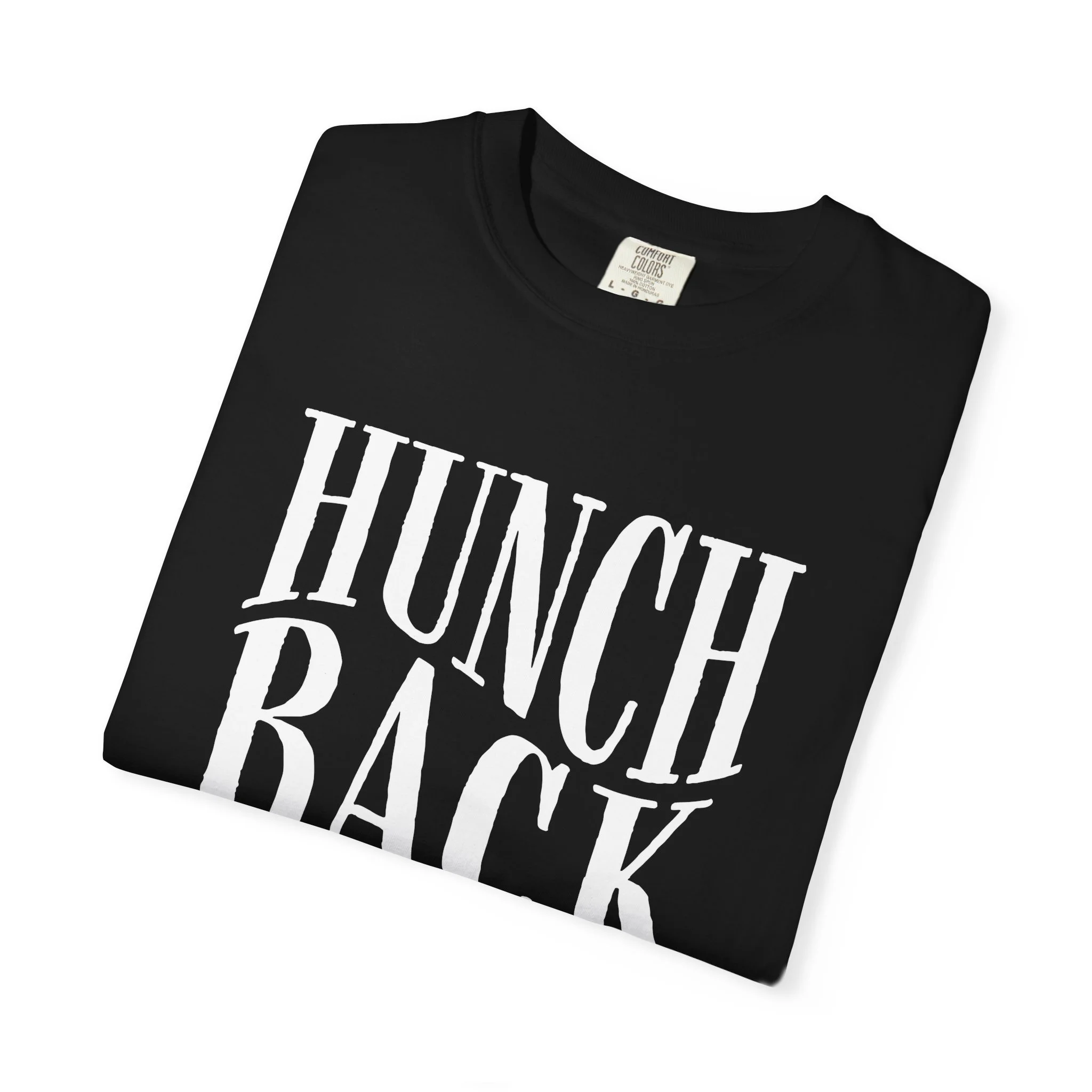 A typographic shirt built around the bend. The letters lean and curve with a subtle hunch to them, not broken, just shaped with intention. Big, groovy serif forms that feel hand tuned and slightly off in the best way. It carries that quiet, slightly defiant energy that lives at the core of Hunchback. Clean, bold type doing all the talking.